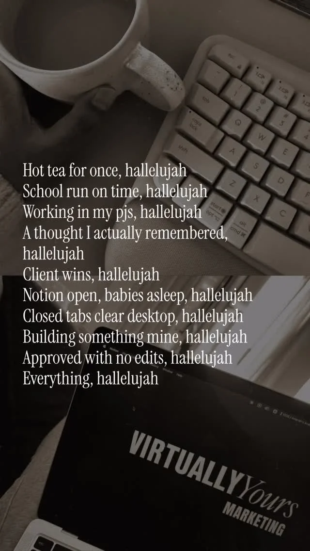 1:1 support, marketing guidance, and strategic direction to help you show up with intention and build momentum in a way that feels sustainable. A premium deep-dive into your messaging, content, and creative direction - designed to give you clarity, confidence, and a marketing plan that finally makes sense.